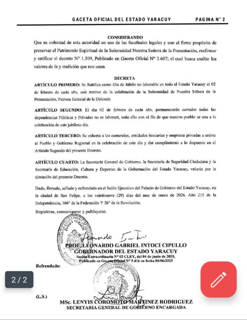 En el artículo 2 de la gaceta se establece que este lunes 2 de febrero, las dependencias públicas y privadas no laborarán y permanecerán cerradas con el propósito de que el pueblo se una a la celebración de las actividades para celebrar el júbilo por el Día de la Patrona de Yaracuy.