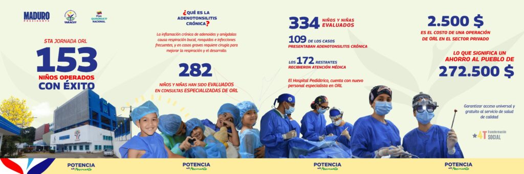 Un total de 153 niños y niñas de Yaracuy con patología de adenoiditis crónica han sido intervenidos exitosamente en el Hospital Pediátrico Niño Jesús a través del plan especial quirúrgico de otorrinolaringología (ORL) que lleva adelante el gobernador Leonardo Intoci para dar respuesta a la demanda de asistencia en esta área especializada de salud, cumpliendo así con la 4ta Transformación del Plan de la Patria, que promueve el presidente Nicolás Maduro para ofrecer, según ha señalado, la máxima de protección al pueblo.